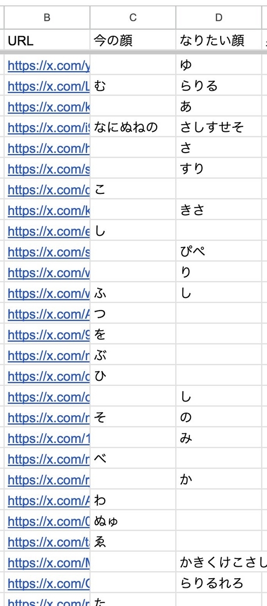たいていSNSでテキストを収集するときって「もかな〜〜」みたいなどっちだよ!ってなるポストが多く寄せられがちなのですが、今回は顔をひらがなになぞらえるという新規性があるおかげなのか、わかりづらいポストがほとんどありませんでした。