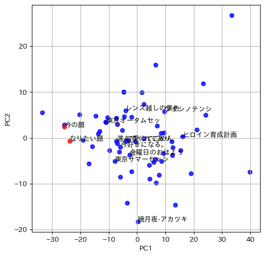 これに先ほど出した今の顔、なりたい顔を追加して78列65行のデータとし、これを主成分分析で2次元に圧縮して散布図を描きます。